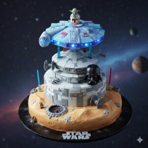 漆黒のケーキに白の差し色を合わせれば、銀河の奥行きやライトサイドの光が自然と立ち上がり、食べる前に世界観が伝わる構図に。
