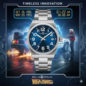 その中でも「BR 05」は、ギミック付き文字盤とミリタリー調ベルトが特徴で、デロリアンの機械美や映画の冒険心を腕元で表現が可能。