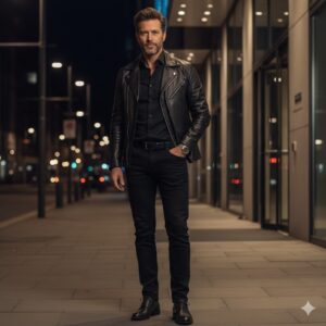 レザーすぎず、派手すぎない、落ち着いた大人のための「ロックコーデ」。