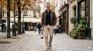 - アウター: 軽量ドライバージャケット(ブラウンレザー)