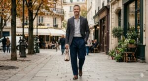 - トップス: ライトグレーのボタンダウンシャツ