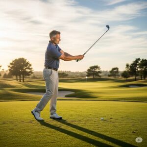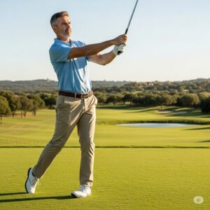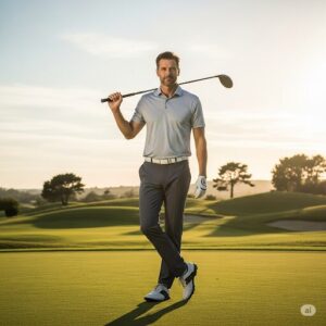 伸縮性やストレッチ素材で歩行やスイングを妨げず、防シワ・速乾性のある素材を選ぶと、ラウンド中も見た目が整い、大人の男性らしい印象を保てます。