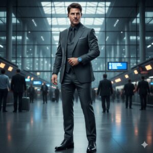 空港シーンでイーサン・ハントが着用していたネイビーブルーのスーツが最も印象的です。