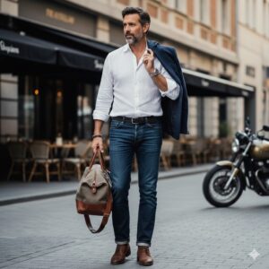 Tシャツ+デニムでも成立し、ジャケットスタイルに合わせても違和感がありません。