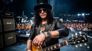 レスポールを抱えて長いギターソロを披露するスラッシュのパフォーマンスは、まさにロックのエネルギーそのもの。
