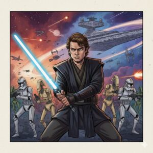 希望と恐怖、理性と感情の狭間で葛藤し、師匠オビ=ワンとの師弟関係や愛する人への思い、銀河を揺るがす選択を経て、内面の闇と光が交錯する運命にあります。