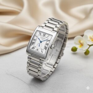 スクエアケースとシルバー文字盤の組み合わせが手元に上品さをプラス。
