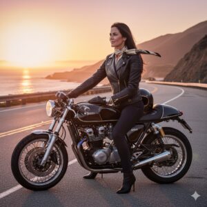 レザーストラップやジャケットスタイルにも自然に馴染み、女性らしい華やかさとクラシックバイクのタフさを両立できます。